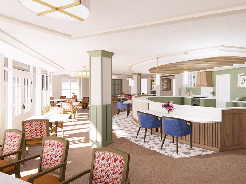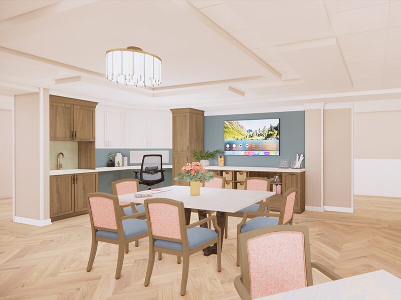 The specialty lighting design promotes a luxury resort feel while providing quality lighting levels to support the specific needs of a skilled nursing environment.